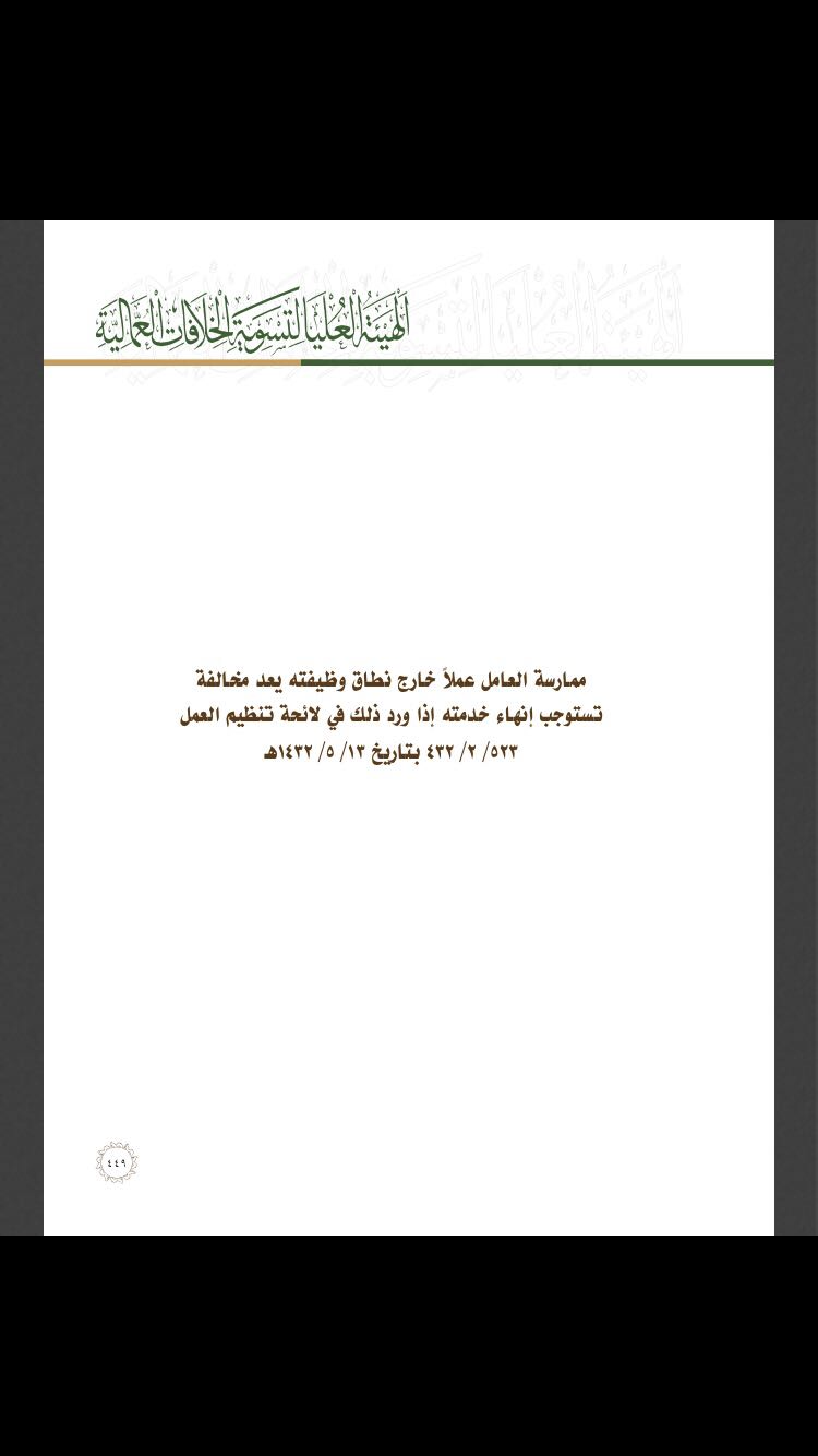 ممارسة العامل عملاً خارج نطاق وظيفته يعد مخالفة تستوجب إنهاء خدمته إذا ورد ذلك في لائحة تنظيم العمل